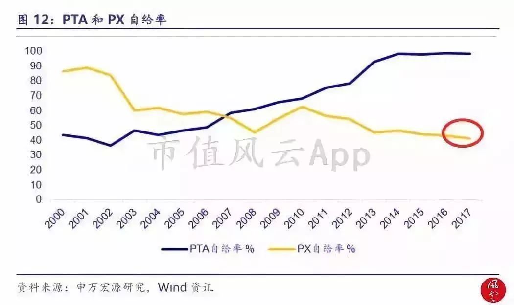 通過以上分析,不難發(fā)現(xiàn)“PX-PTA”行業(yè)仍然屬于景氣度較高的行業(yè)。“PTA-聚酯”未來兩年內(nèi)處于供需基本平衡或略有過剩狀態(tài),PX處于自給率快速提升階段。而在此之前PX嚴(yán)重依賴進(jìn)口,使得下游的PTA企業(yè)議價能力較弱,這也導(dǎo)致了PTA、PET、滌綸以及紡織服裝企業(yè)的原材料成本較高。