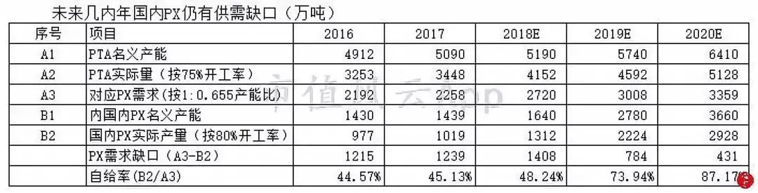 (來源:PTA的2016年開工率66%,2017年開工率68%;其他數(shù)據(jù)來源中纖網(wǎng),國金證券研究所等,PX新增產(chǎn)能只統(tǒng)計(jì)確定性高的產(chǎn)能,2019年后PX產(chǎn)量中包括文萊項(xiàng)目的名義150萬噸,特別說明:本統(tǒng)計(jì)數(shù)據(jù)或與其他機(jī)構(gòu)發(fā)布數(shù)據(jù)存在一定出入。)