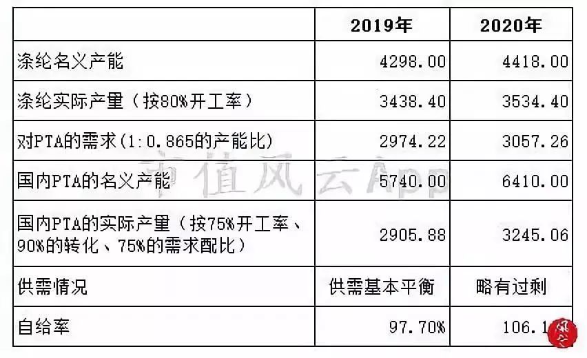 通過測算下游的滌綸產(chǎn)能進(jìn)而推算未來兩年P(guān)TA-滌綸的或供需維持基本平衡的狀態(tài),見下表: