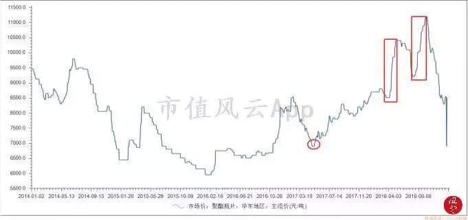 2017年5月份聚酯瓶片的價格創(chuàng)下2年的低點(diǎn)7100元/噸后,隨即一路震蕩上漲,2018年4月從8500元/噸在半個月內(nèi)飆漲到9500元/噸(4月27日),漲幅超過15%,隨后在9月10日又一度上漲到11200元/噸。