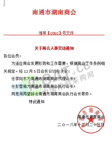 據涂料采購網消息,昨日(12月23日)南通市湖南商會發布《關于商會人事變動的通知》稱,為適應商會發展形勢和工作需要,根據商會工作條例相關規定,經12月5日會長討論與決議: