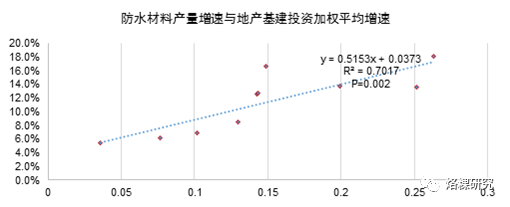 需求未來三年CAGR5.4%。通過對過去10年的數(shù)據(jù)進(jìn)行分析,我們發(fā)現(xiàn)防水材料產(chǎn)量增速與價(jià)格調(diào)整后的地產(chǎn)、基建投資加權(quán)平均增速存在線性相關(guān)關(guān)系,擬合度可以達(dá)到0.7且顯著。通過這一相關(guān)關(guān)系,結(jié)合我們對未來地產(chǎn)、基建投資的預(yù)測,即可推算未來防水材料需求增速。基于我國建筑業(yè)投資放緩的大方向,我們假設(shè)未來三年剔除價(jià)格因素后的實(shí)際地產(chǎn)、基建投資增速為3%、4%,據(jù)此估算未來三年防水材料市場規(guī)模CAGR為5.4%。