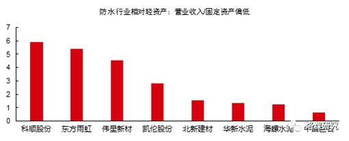 低端防水具有低門檻、輕資產(chǎn)特點(diǎn)。目前國內(nèi)防水材料企業(yè)數(shù)量龐大,只有少部分企業(yè)具有較高的技術(shù)水平和產(chǎn)品質(zhì)量,大部分企業(yè)規(guī)模較小、技術(shù)落后、產(chǎn)品質(zhì)量不達(dá)標(biāo)。這是由于低端防水產(chǎn)品技術(shù)門檻不高,同時(shí)防水產(chǎn)品生產(chǎn)設(shè)備投資額相對較低,導(dǎo)致在行業(yè)發(fā)展初期大量小企業(yè)進(jìn)入。2017年規(guī)模以上防水材料企業(yè)營業(yè)收入1059.4億元,利潤總額71.8億元。三家上市公司東方雨虹、科順股份、凱倫股份2017年主營業(yè)務(wù)收入合計(jì)127.26億元,利潤總額17.5億元,分別僅占規(guī)模以上企業(yè)相應(yīng)指標(biāo)的12.0%和24.4%。由于非規(guī)模以上企業(yè)數(shù)量龐大,若考慮防水材料整體市場,則集中度指標(biāo)會更低。