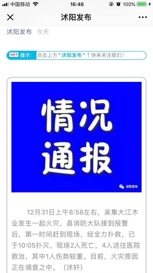 12月31日上午8點58分左右,江蘇宿遷市沭陽縣吳集鎮“大江木業”發生一起火災。沭陽縣委宣傳部通報稱,當地消防大隊接到報警后趕到現場,經全力撲救,火情于10點05分撲滅,現場2人死亡,4人送往醫院救治,其中1人傷勢較重。目前,火災原因正在調查之中。