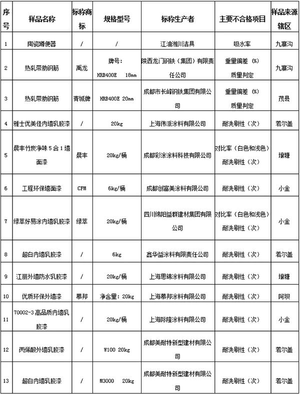 為切實(shí)加強(qiáng)流通領(lǐng)域商品質(zhì)量監(jiān)管,有效保護(hù)廣大消費(fèi)者合法權(quán)益,2018年,阿壩州工商局依法組織在全州流通領(lǐng)域開展了服裝鞋帽、家居用品、個(gè)人生活用品、兒童用品、家用電器、珠寶玉石、五金交電、建材及裝飾裝修材料、消防產(chǎn)品、燃油、農(nóng)資、交通工具共12類21種商品質(zhì)量抽查檢驗(yàn)。抽檢結(jié)果顯示,共有13批次產(chǎn)品抽檢不合格,其中成都彩涂涂料科技有限公司、上海偉派涂料有限公司、成都創(chuàng)富美涂料有限公司、四川綿陽益群建材集團(tuán)有限公司、鑫華益涂料有限責(zé)任公司、上海思錦涂料有限公司、上海慕邦涂料有限公司、上海際隆涂料有限公司、成都美耐特新型建材有限公司等9家公司生產(chǎn)的產(chǎn)品均被檢出不合格。