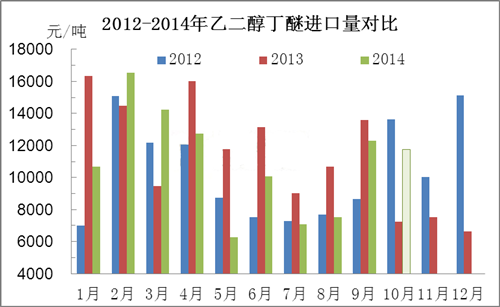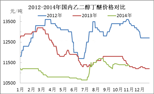 圖1為2012-2014年國內乙二醇丁醚華東市場價格走勢對比。近3年來,國內市場價格震蕩起伏,但不難發現,年末、年初及年中階段,乙二醇丁醚市場價格進入谷底,清明節后及傳統旺季期間(金九銀十),市場將迎來反彈狂潮。然2014年市場一反常態,上半年,市場供需矛盾凸顯,價格持續走軟,直至下半年,因國內外裝置檢修,社會庫存減緩等利好提振下,市場小幅反彈,然反彈力度有限,與去年價格相比暫無較大差異,然與2012年同期相比,價差均在1000元/噸以上,慘不忍睹。年末,市場需求轉淡,供應壓力凸顯,廠商量價不能兩全,市場低價探市者頻現,因此小編認為今年市場也不能逃脫跌價的魔咒,然全年來看企業盈利微薄,企業運營壓力不減,大幅降價的可能性不大,跌幅控制在100-200元/噸附近,僵持運行為主。