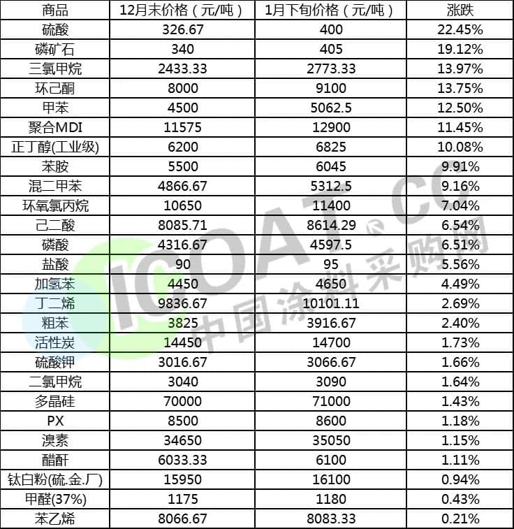 除PTA價(jià)格上漲之外,硫酸、三氯甲烷、環(huán)乙酮、甲苯、聚合MDI等幾十種的材料價(jià)格也較2018年末的價(jià)格出現(xiàn)了不同程度的上漲, 最高漲價(jià)達(dá)22.45%。部分化工原材料上漲比例如下: