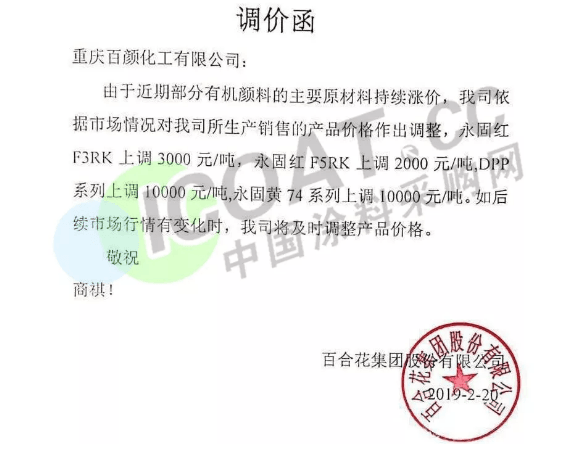 據(jù)涂料采購網(wǎng)消息,百合花集團近日發(fā)布通知稱,由于近期部分有機顏料的主要原材料持續(xù)漲價,百合花集團依據(jù)市場情況對于公司生產(chǎn)銷售的產(chǎn)品價格出調(diào)整,永固紅F3RK上調(diào)3000元/噸,永固紅F5RK上調(diào)2000元/噸,DPP系列上調(diào)10000元/噸,永固黃74系列上調(diào)10000元/噸。