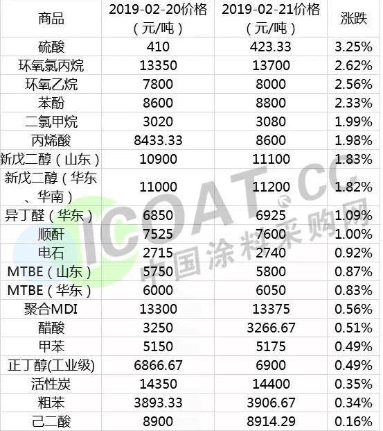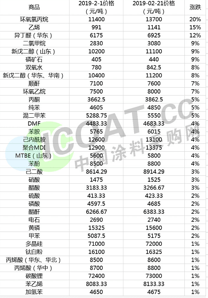 很多企業(yè)表示,現(xiàn)在漲價已經(jīng)是習以為常了。但是如果把近一兩個月的漲價幅度算到一起,真的很受不了。據(jù)涂料采購網(wǎng)不完統(tǒng)計,2月2日至2月21日,硫酸漲幅達3.25%,參考價在410-430之間,環(huán)氧氯丙烷、環(huán)氧乙烷、苯酚等都處于上漲趨勢,漲幅在2%~3%之間。就2月15日往后來看,原材料漲價這一趨勢并沒有消退。