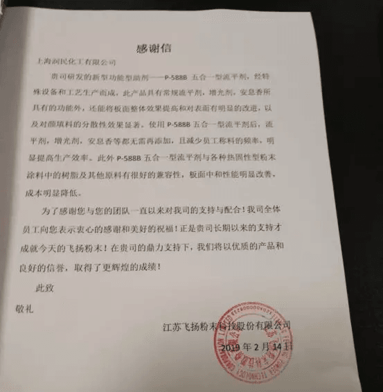 近日,國內(nèi)粉末涂料行業(yè)優(yōu)秀供應(yīng)商、改性流平劑細分品牌企業(yè)上海潤民化工有限公司收到一封來自于江蘇飛揚粉體科技股份有限公司的感謝信。對于上海潤化工來說,這是2019年情人節(jié)收到的最好禮物。
