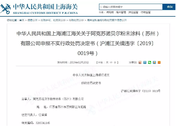 據(jù)涂料采購網(wǎng)了解,2月20日,中華人民共和國上海浦江海關(guān)關(guān)于阿克蘇諾貝爾粉末涂料(蘇州)有限公司申報不實行政處罰決定稱,阿克蘇諾貝爾粉末涂料(蘇州)有限公司委托上海嵐舟國際貨物運輸代理有限公司向海關(guān)申報進口一般貿(mào)易項下環(huán)氧粉末17600千克,申報總價FOB39248歐元,申報商品編號3907300001,進口關(guān)稅稅率4%,報關(guān)單號220120181018043708。經(jīng)查,上述貨物實際商品編號應為3907300090,關(guān)稅稅率6.5%。