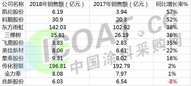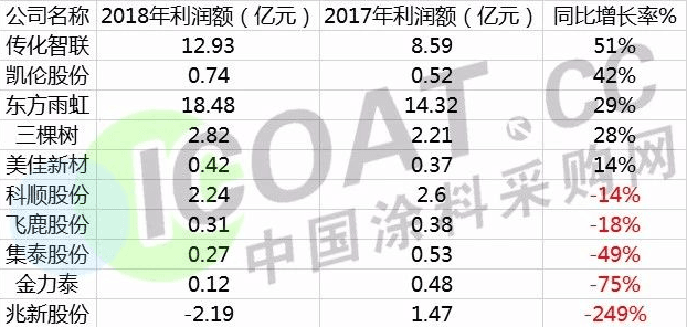 反觀涂料企業(yè),可謂是“舉步維艱”的狀態(tài),原材料持續(xù)上漲,市場需求不佳,在這樣一波三折的狀態(tài)下,各大企業(yè)喜憂參半。雖然大部分企業(yè)的銷售額有所上漲(更多來自原材料漲價帶來的成品價格上漲所致),但是盈利狀態(tài)可謂相當(dāng)?shù)?ldquo;可憐”,很多規(guī)模企業(yè)一年的利潤額不足原材料企業(yè)的一個零頭,下圖為部分公司公布2018年年度業(yè)績報告:
