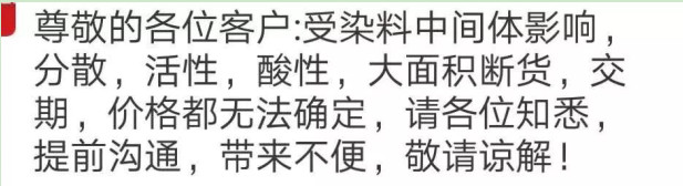 據涂料采購網了解,受“3.21”化工廠爆炸的影響,染料中間體間苯二胺價格依然在大幅上漲,據業內人士介紹,間苯二胺目前市場價格已越過15萬元/噸大關,具體漲到多少還要根據市場需求情況而定。預計近期間苯二胺將會持續處于高位上漲的狀態。個別分散染料已經斷貨,活性染料部分產品也相對短缺。比如93紫、291藍、紅玉等等目前都已斷貨。