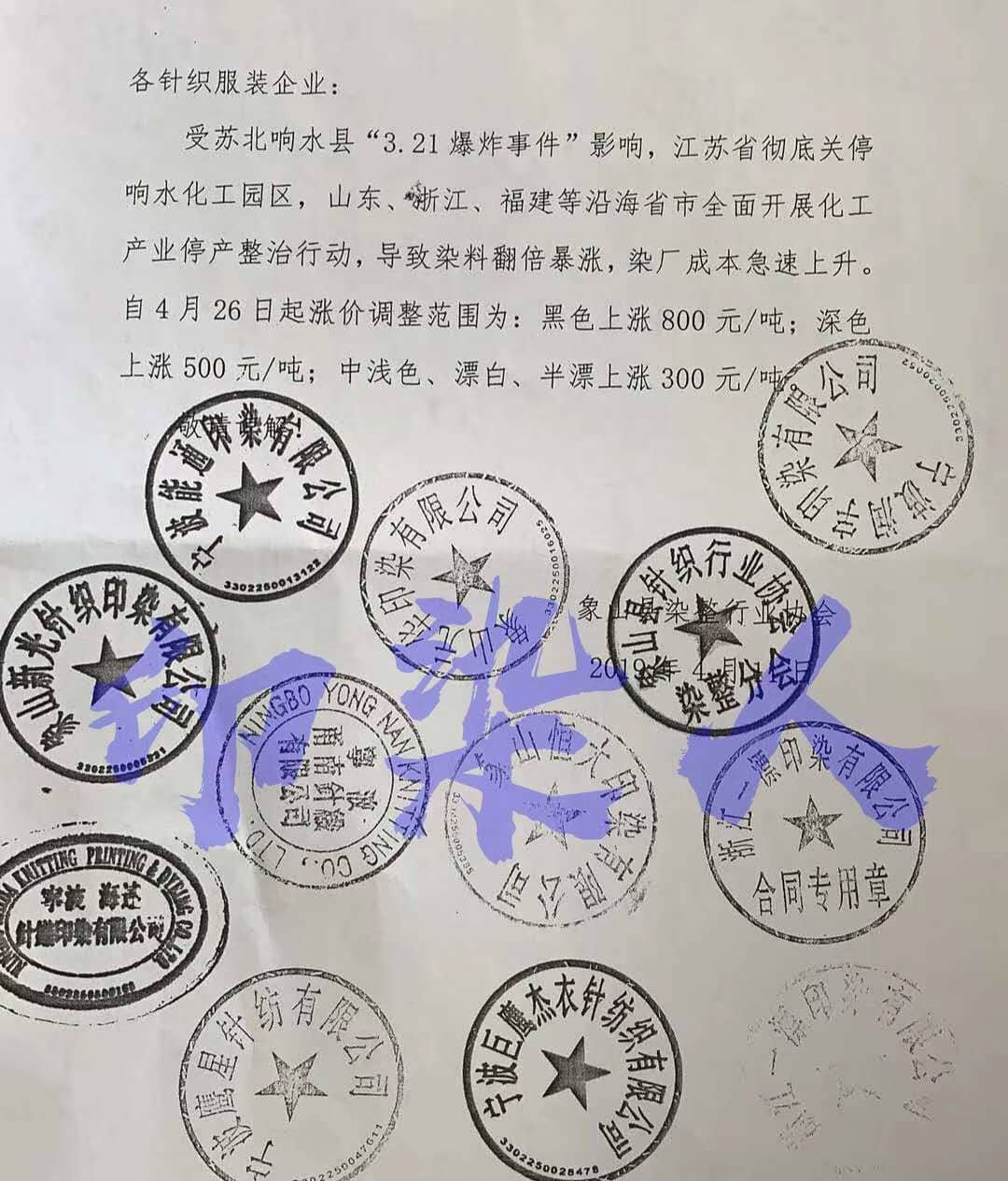但是涂料采購網了解,4月20日,象山縣染整行業協會、象山縣針織行業協會染整分會以及數十家印染企業聯合發布漲價通稱:自4月26日起漲價調整范圍為:黑色上漲800元/噸;深色上漲500元/噸;中淺色、漂白、半漂上漲300元/噸。