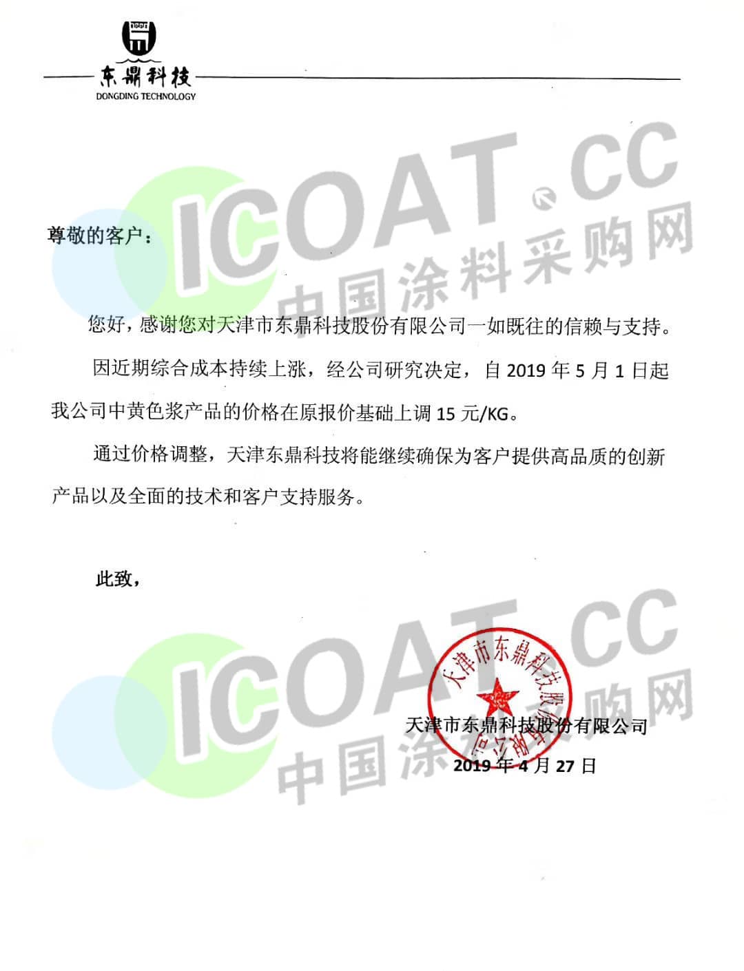 近日,天津市東鼎科技股份有限公司稱,因近期綜合成本持續(xù)上漲,經(jīng)公司研究決定,自2019年5月1日起,黃色漿產(chǎn)品的價(jià)格在原價(jià)基礎(chǔ)上上調(diào)15元/kg!