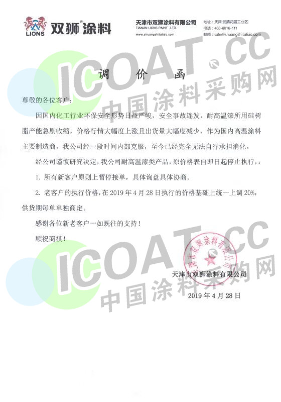 涂料企業(yè)在一波接一波的原材料價(jià)格上漲之后也扛不住成本端的壓力,應(yīng)聲發(fā)出漲價(jià)函。4月28日,天津市雙獅涂料有限公司發(fā)出《調(diào)價(jià)函》稱,因國內(nèi)化工行業(yè)環(huán)保安全形勢日益嚴(yán)峻,安全事故連發(fā),耐高溫漆所有硅樹脂產(chǎn)能急劇收縮,價(jià)格行情大幅度上漲且出貨量大幅度減少,作為國內(nèi)高溫涂料主要制造商,公司經(jīng)一段時(shí)間內(nèi)部克服,至今已經(jīng)完全無法自行承擔(dān)消化,經(jīng)公司謹(jǐn)慎決定,所有新客戶暫停接單,暫時(shí)停盤,老客戶的執(zhí)行價(jià)格在原有基礎(chǔ)上上調(diào)20%,供貨期每單單獨(dú)商定!