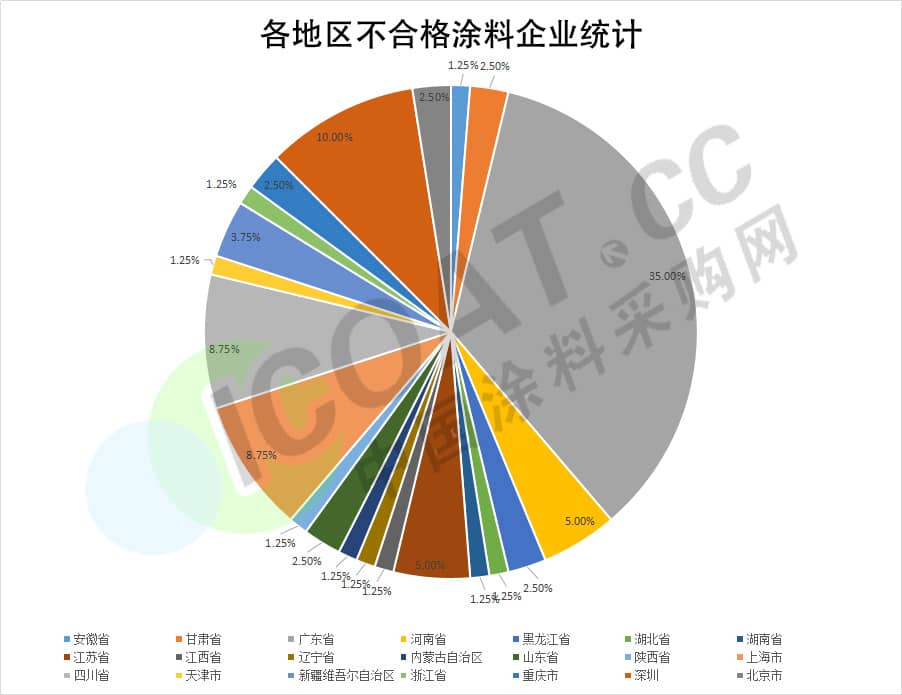 根據(jù)圖表數(shù)據(jù)可以看出,自2019年1月1日起,各省市陸續(xù)公布不合格的涂料企業(yè)共100多批次,其中廣東、江蘇為重災(zāi)區(qū)。