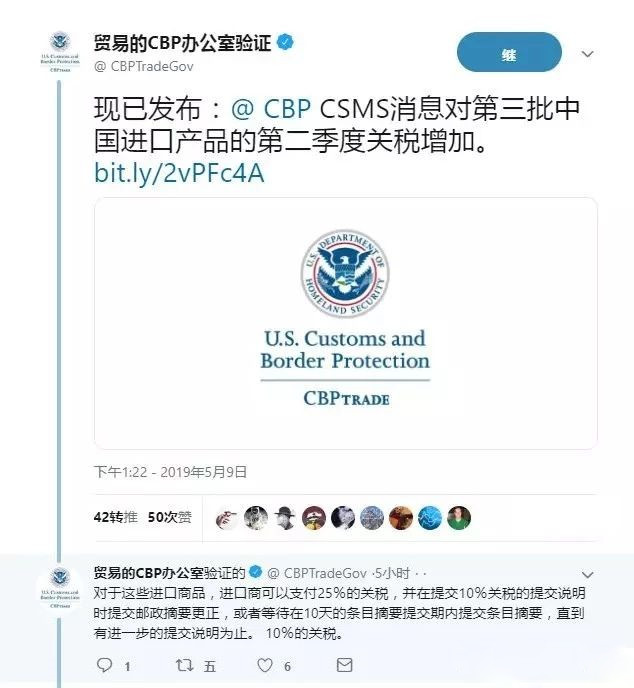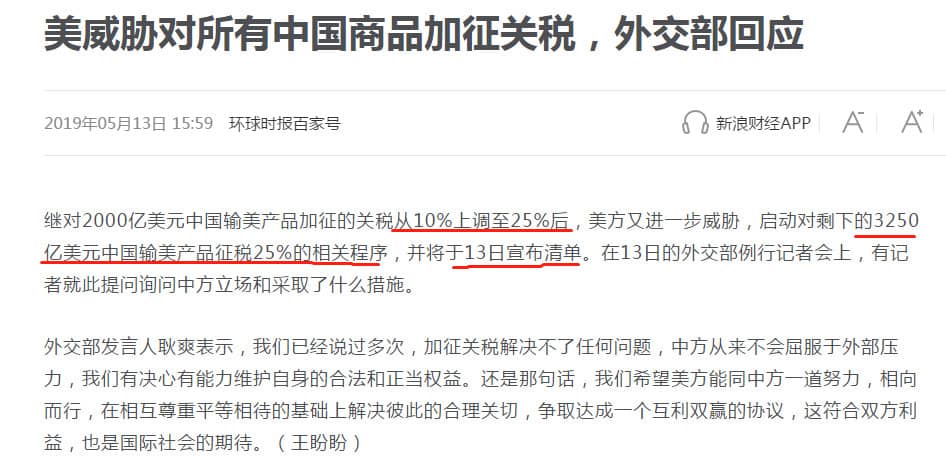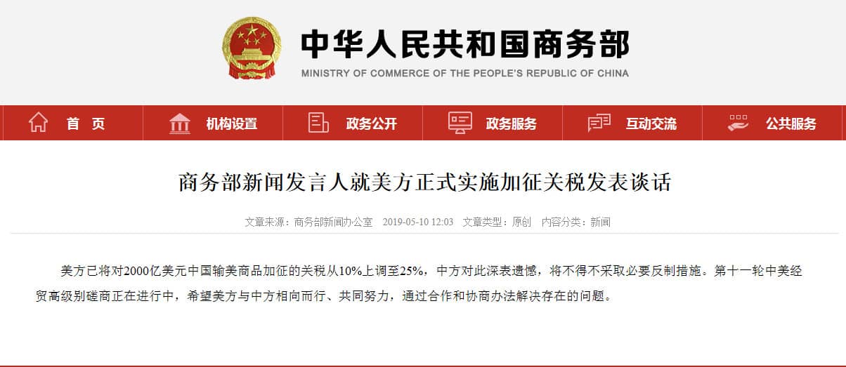而在5月10日,美方對2000億美元中國輸美商品加征的關稅從10%升至25%。對于美方此舉,中方深表遺憾,并將不得不采取必要反制措施,同時再度重申:加征關稅無法解決問題,合作和協商才是正確出路,但必須以尊重彼此核心關切為前提。
