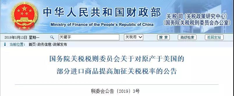 昨日(5月13日),國務院關稅稅則委員會發布公告決定對原產于美國的部分進口商品提高加征關稅稅率的公告稱,根據《中華人民共和國對外貿易法》《中華人民共和國進出口關稅條例》等法律法規和國際法基本原則,經黨中央、國務院批準,國務院關稅稅則委員會決定,自2019年6月1日0時起,對《國務院關稅稅則委員會關于對原產于美國約600億美元進口商品實施加征關稅的公告》(稅委會公告〔2018〕8號)中部分商品,提高加征關稅稅率,按照《國務院關稅稅則委員會關于對原產于美國的部分進口商品(第二批)加征關稅的公告》(稅委會公告〔2018〕6號)公告的稅率實施。即:2493個稅目商品,實施加征25%的關稅;1078個稅目商品,實施加征20%的關稅;對974個稅目商品,實施加征10%的關稅。對595個稅目商品,仍實施加征5%的關稅。