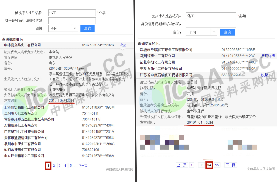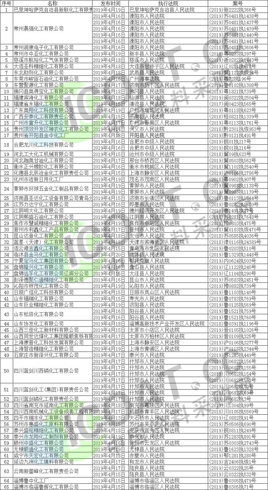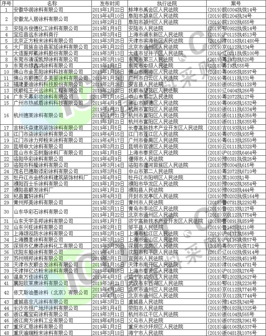 據全國各地法院統計,自2019年1月份以來,整個化工行業的失信企業數量竟然高達900多家,涂料企業近50家進入失信名單,可謂是化工行業的一次“大地震”,部分失信企業名單如下: