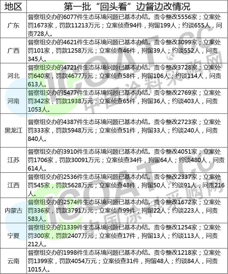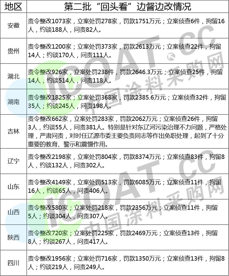 以下為涂料采購網(wǎng)整理的20個省份第一輪中央環(huán)境保護督察“回頭看”邊督邊改情況匯總: