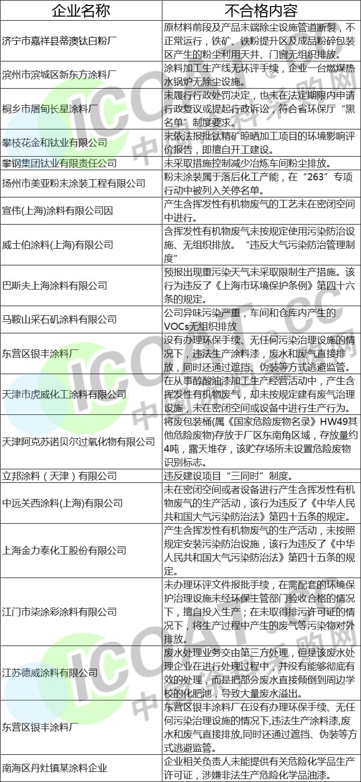 據(jù)涂料采購網(wǎng)了解,在第一輪督察及“回頭看”中,有近千家涂料企業(yè)因為環(huán)保等問題被責(zé)令整改和查處,以下為部分環(huán)保不合格涂料企業(yè)的名單: