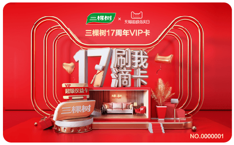 為了讓用戶更好的感知品牌周年慶典,增加三棵樹周年慶活動儀式感。三棵樹聯(lián)手天貓IP公仔,打造定制款三棵樹專屬貓公仔,推出公仔與權益卡的超級定制禮盒。