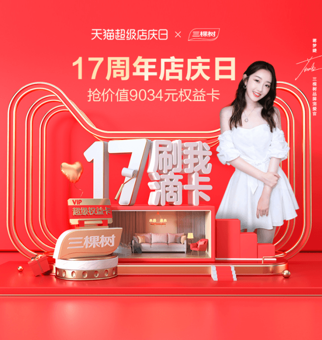 5月17日,國內“健康漆”倡導品牌三棵樹迎來了17周年生日。在消費升級、年輕人逐漸占主導的市場大環(huán)境下,三棵樹聯(lián)手天貓超級店慶日,在臨近520特殊節(jié)點,以“刷我滴卡我寵你”為主題,發(fā)布品牌超級權益卡TVC,在品牌寵愛官蔣夢婕的助力下,與目標消費者深入互動,實現品牌與年輕消費者連接,成為天貓基礎行業(yè)建材銷量TOP1,打出一套漂亮的營銷組合拳。