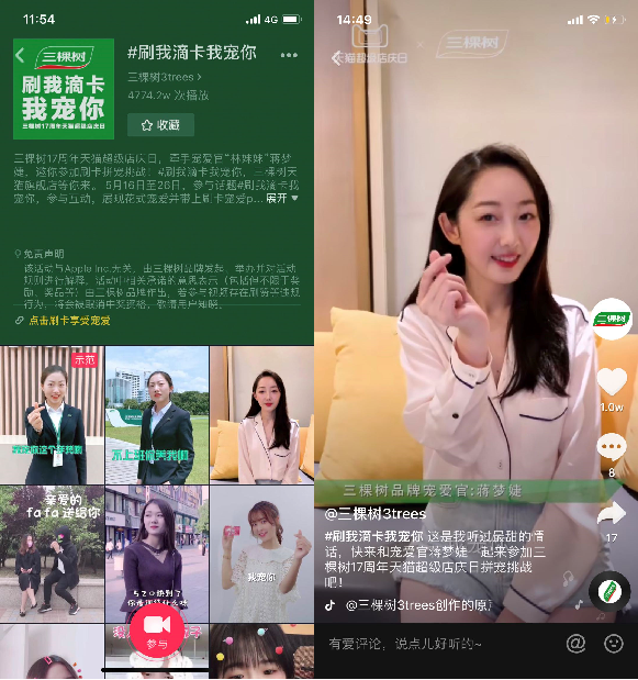三棵樹品牌以“刷我滴卡我寵你”為營銷主題發(fā)起抖音挑戰(zhàn)賽,更是在520告白節(jié)之前,隆重推出限量版品牌超級權益卡,最終話題曝光量高達4700萬,為品牌定向拓展了一二線年輕消費市場。