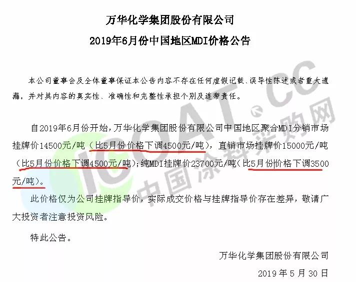 位列全球化工50強(qiáng)的萬華化學(xué),是中國唯一、世界少數(shù)擁有MDI自主知識(shí)產(chǎn)權(quán)的化工企業(yè),可謂行業(yè)龍頭。近日,萬華化學(xué)發(fā)布公告,稱自2019年6月份開始,萬華化學(xué)集團(tuán)股份有限公司中國地區(qū)聚合MDI分銷市場掛牌價(jià)14500元/噸(比5月份價(jià)格下調(diào)4500元/噸),直銷市場掛牌價(jià)15000元/噸(比5月份價(jià)格下調(diào)4500元/噸);純MDI掛牌價(jià)23700元/噸(比5月份價(jià)格下調(diào)3500元/噸)。