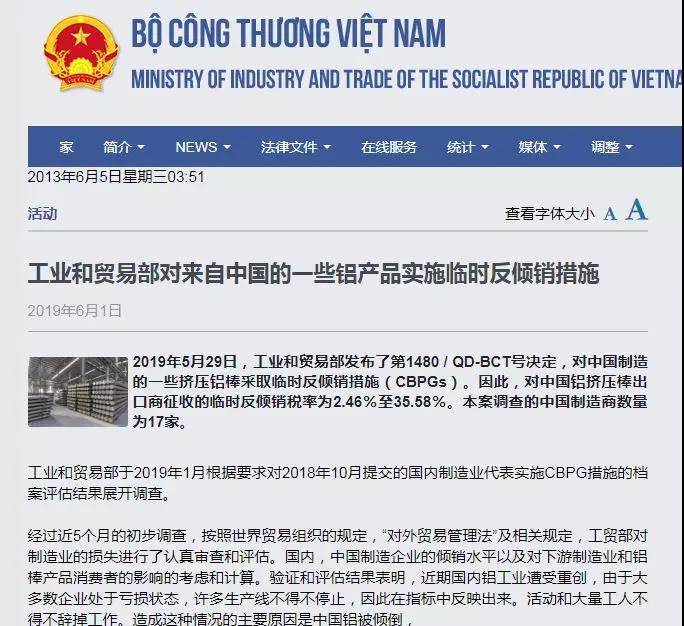 越南商務(wù)部稱中國(guó)鋁型材出口量過大,根據(jù)其官網(wǎng)數(shù)據(jù),2018年越南從中國(guó)進(jìn)口的鋁擠壓材超過6.2萬噸,這一數(shù)量相較于2017年幾乎翻倍,同時(shí)該國(guó)進(jìn)口的其他國(guó)家鋁材持續(xù)減少。中國(guó)向其大量出口鋁材形成兩個(gè)結(jié)果:一是損害了越南本國(guó)鋁材企業(yè)的利益,使其本國(guó)企業(yè)處于虧損停產(chǎn)狀態(tài);二是美國(guó)開始對(duì)越南的擠壓鋁材征收關(guān)稅,因?yàn)榇嬖谥袊?guó)出口至越南的鋁材二次出口至美國(guó)的情況。