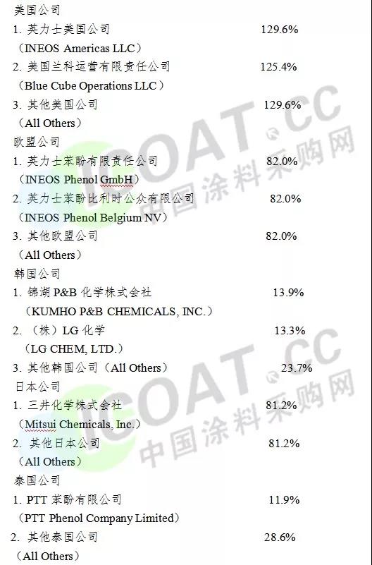5月27日,商務部發布2019年第22號公告,對原產于美國、歐盟、韓國、日本和泰國的進口苯酚反傾銷調查初步裁定。對各公司征收的保證金比率如下: