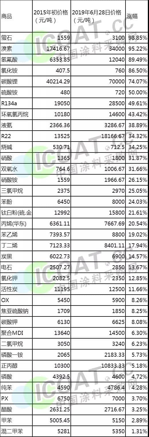 據涂料采購網了解,第一次環保督察時,化工廠關閉,化工原料飛漲,局部地區出現斷貨情況。除此之外,任何一個突發事故都有可能會造成部分原材料價格異動。近四年來,國內部分化工產品價格漲幅如下: