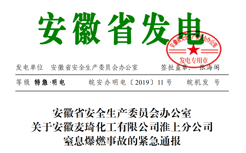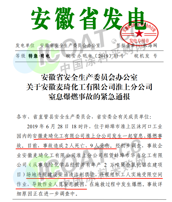 經初步調查,事故企業安徽麥琦化工有限公司淮上分公司租賃蚌埠市華海化工有限公司(從事危險化學品經營并有年產2萬噸聚合氯化鋁在建項目)場地違規建設柴油清潔劑項目,違規組織工人實施受限空間作業,導致作業人員窒息被因,在施救過程中發生爆燃。事故詳細原因正在進一步調查中。