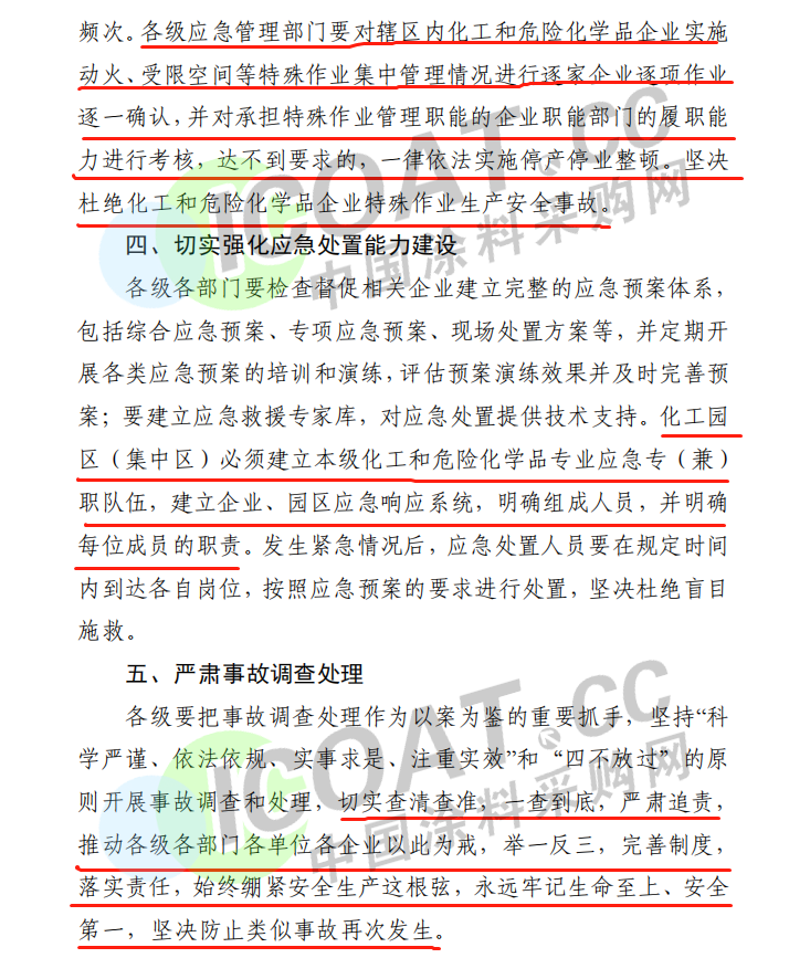 各級各部門要對轄區內及管理行業企業立即組織開展全面排查,各類工業園區要不落一家企業,各企業要不落一個角落,各在建項目要不落一個環節,深入查找整治安全隱患,堅決依法嚴厲清除化工和危險化學品非法租賃、建設、生產、儲存和經營問題。