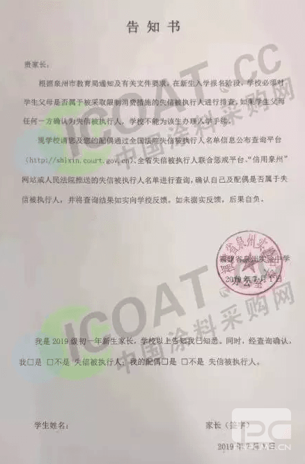 近日,一則福建某中學(xué)的告知書刷爆網(wǎng)絡(luò),該告知書稱,根據(jù)(福建省)泉州市教育局通知,在新生入學(xué)報(bào)名階段,學(xué)校必須對(duì)學(xué)生父母是否屬于被采取限制消費(fèi)措施的失信被執(zhí)行人進(jìn)行排查,如果學(xué)生父母任何一方確認(rèn)為失信被執(zhí)行人,學(xué)校不能為該生辦理入學(xué)手續(xù)。此消息一出,如同在社會(huì)上扔下了一枚“炸彈”。近年來“老賴”橫行,越來越多的人因?yàn)榍穫贿€,違約違規(guī),惡意賴賬等原因成為“老賴”,與“老賴”合作的人因?yàn)槟貌坏綉?yīng)有的貨款或是無(wú)法追回合法的權(quán)益而捶胸頓足,還有很多人紛紛抱怨,蒼天啊,難道真的沒有人能懲治“老賴”了嗎?而這一則告知書則用事實(shí)告訴了我們,不守信用,被列入失信名單,是有相應(yīng)的處罰措施的。