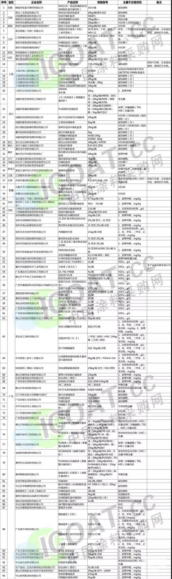 近日,水性科天因其水性漆宣稱無毒卻屢曝有毒,被檢出總揮發性有機物不合格,登上了“2018-2019中國家居十大質量黑榜”,2019年已經過半,各地市場監察部門曝出眾多不合格的涂料企業,據涂料采購網不完全統計,自2019年以來公布的涂料產品抽檢結果當中,不合格的涂料產品達到超過100批次,其中涵蓋了涂料大省廣東,江蘇,四川等地區。抽檢品種包括地坪漆、防水涂料、底漆、面漆、乳膠漆等各個類別,查出來的問題也多種多樣,包括VOCs不合格,甲醛超標,苯、甲苯類有害物質不合格等等。