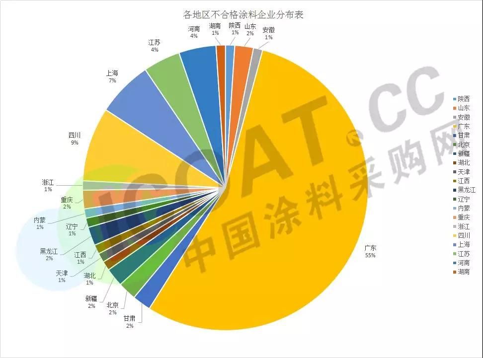 通過以上數據可以看出,自2019年以來,抽查出問題的涂料企業非常之多,分布也較廣,北至內蒙,南至海南均有涉及。其中廣東省被查出不合格企業的數量最多,達到52家,四川被查出8家,其余的地區均有少量企業被抽查出某方面不合格。