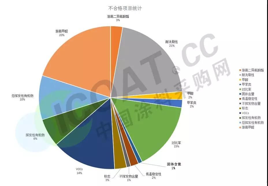 在抽查中被檢查出不合格的因素主要包括游離甲醛,對比率,總揮發性有機物,低溫穩定性等。其中占比最多的是游離甲醛,耐洗刷性,和VOCs不合格等。