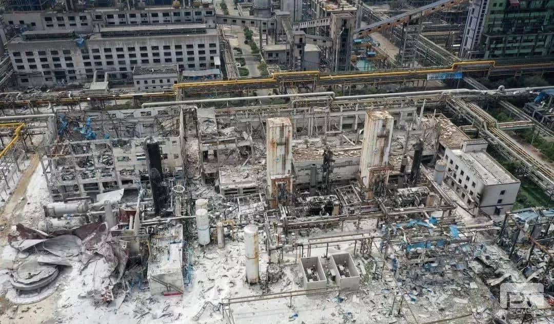 航拍爆炸事故現場,廠區建筑僅剩框架