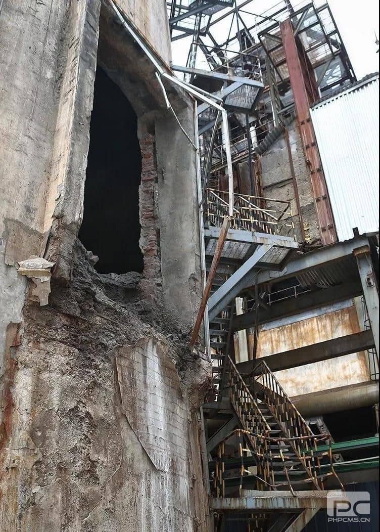 廠區內,窗戶被炸沒了,樓梯變形。