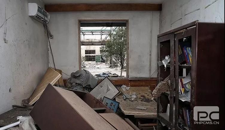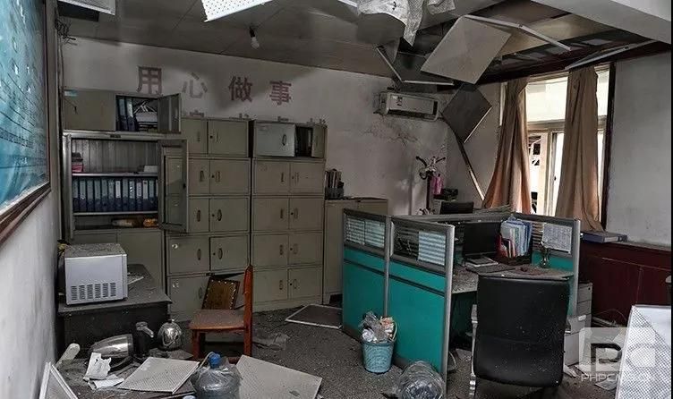 廠區內一間辦公室,窗戶已經被炸飛,家具被氣浪沖倒。