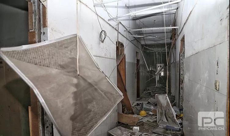 廠區內樓道,天花板掉落,門全部炸飛。