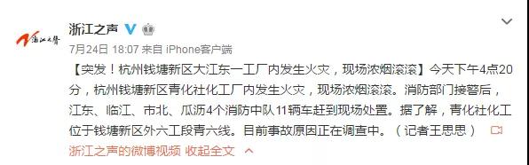 7月24日下午4點20分,浙江省杭州錢塘新區青化社化工廠內發生火災,現場濃煙滾滾。消防部門接警后,江東、臨江、市北、瓜瀝4個消防中隊11輛車趕到現場處置。目前事故原因正在調查中。