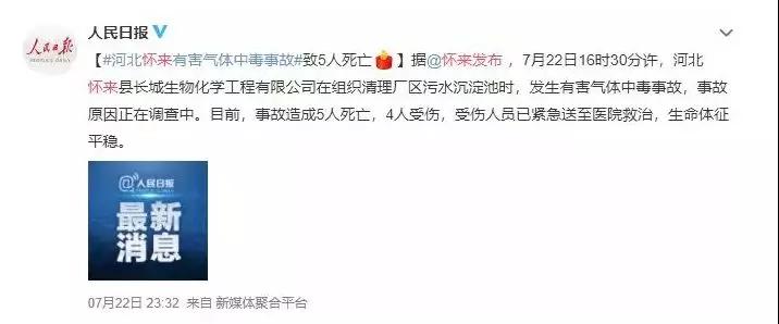 7月22日16時30分許,河北懷來縣長城生物化學工程有限公司在組織人員清理廠區污水沉淀池時,發生有害氣體中毒事故導致5人死亡,4人受傷,受傷人員已緊急送至醫院救治,生命體征平穩。