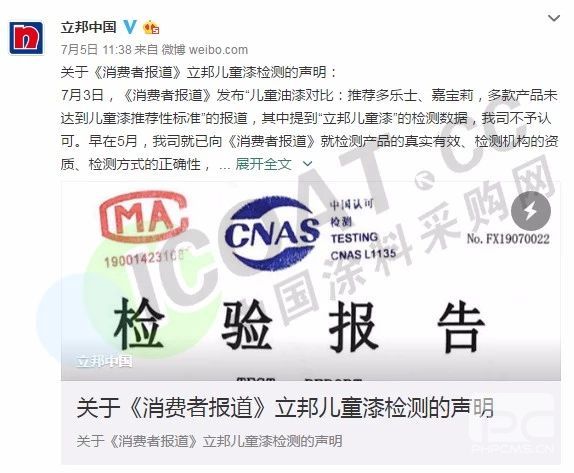 據涂料采購網了解,在此之前,立邦中國官方微博也曾發布過關于《消費者報道》發布的兒童漆對比一文的相關聲明。聲明稱《消費者報道》中提到的“立邦兒童漆檢出甲醛含量高達8mg/kg”的檢測數據,立邦中國不予認可。