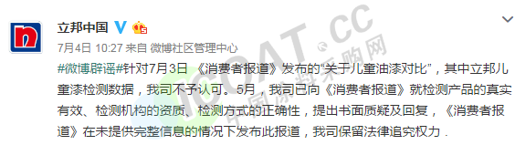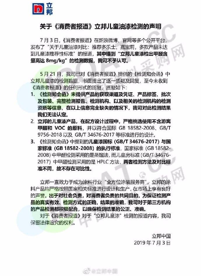 7月3日,《消費者報道》發布“兒童油漆對比:推薦多樂士、嘉寶莉,多款產品未達到兒童漆推薦性標準”的報道,其中提到“立邦兒童漆”的檢測數據,我司不予認可。早在5月,我司就已向《消費者報道》就檢測產品的真實有效、檢測機構的資質、檢測方式的正確性,提出書面質疑及回復,《消費者報道》未就我司的回復,提供任何可保證本次檢測真實有效的信息。