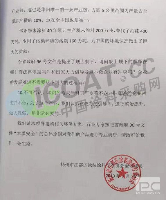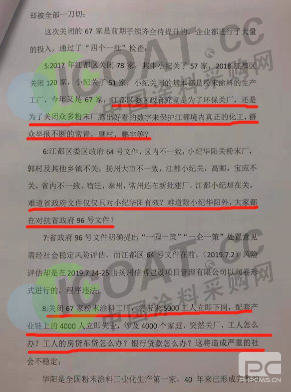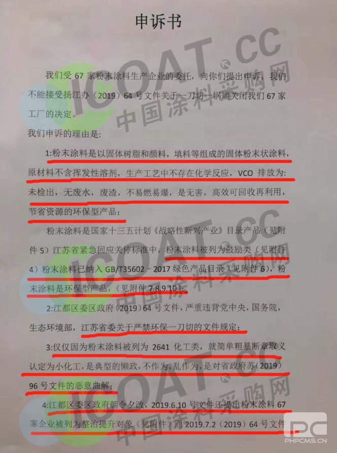 據(jù)《申訴書》相關(guān)內(nèi)容顯示,揚州市江都區(qū)涂裝涂料行業(yè)協(xié)會受67家粉末涂料生產(chǎn)企業(yè)的委托,不能接受揚江辦(2019)64號文件關(guān)于一刀切關(guān)閉67家工廠的決定,并提出了十條申訴理由,具體內(nèi)容如下: