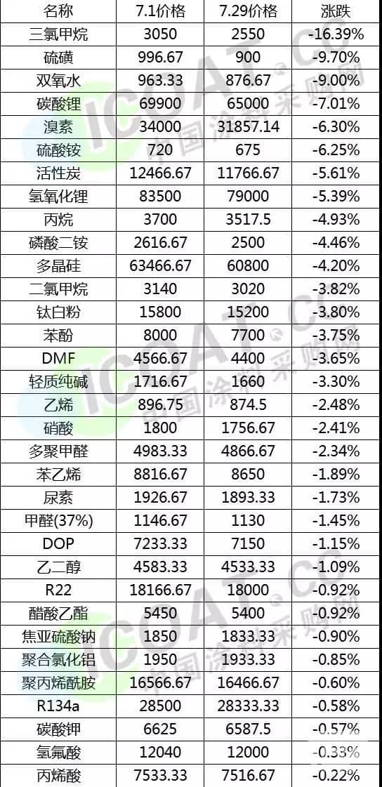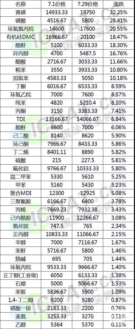 據涂料采購網了解,近期受到一些事故等影響,化工原材料價格波動較大。以下為涂料采購網整理的7月以來部分化工原材料的價格漲跌榜。