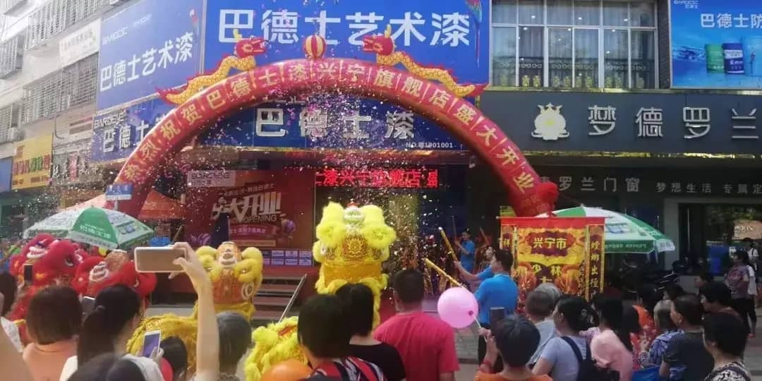 典禮現(xiàn)場(chǎng)彩旗飛舞,鑼鼓喧天,鳳舞龍?bào)矗姆劫e客云集,巴德士集團(tuán)全裝飾涂料事業(yè)營(yíng)銷(xiāo)一部廣東區(qū)李曉明部長(zhǎng)等一行代表公司到場(chǎng)祝賀,與眾賓客共聚一堂,為巴德士藝術(shù)漆入駐廣東興寧擂鼓助威!